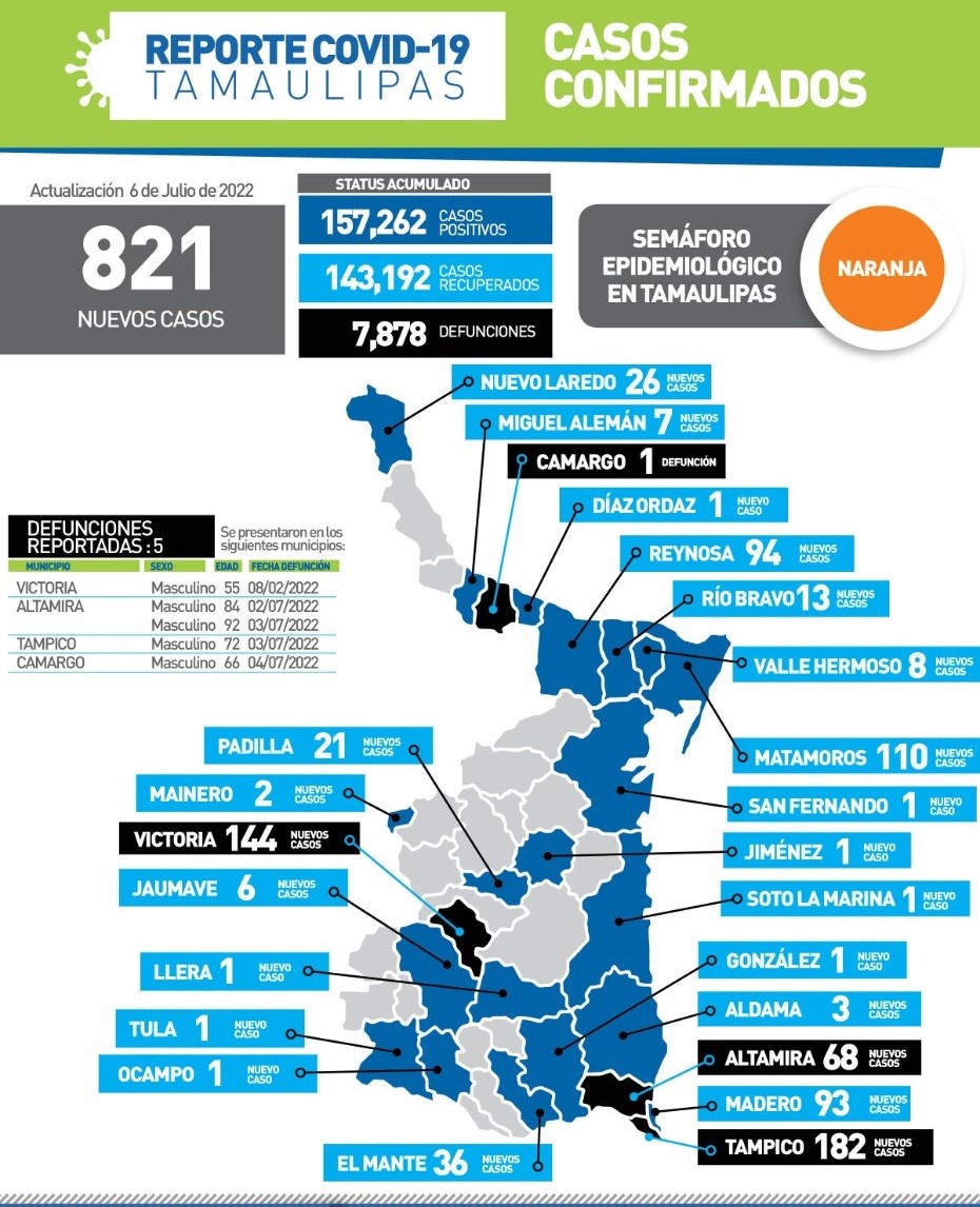 Los contagios estuvieron en 24 de los 43 municipios y quienes concentraron más casos fueron Tampico 182, Victoria 144, Matamoros 110, Reynosa 94, Madero 93, Altamira 68, El Mante 36, Nuevo Laredo 26, Padilla 21 y Río Bravo 13, entre otros.