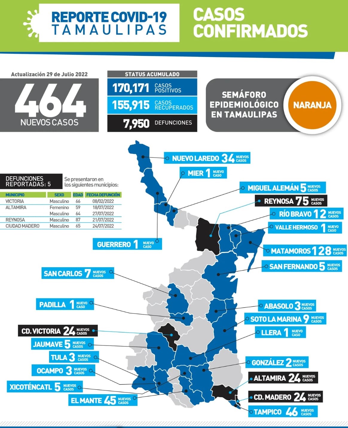Los municipios con mayor número de contagios este viernes fueron Matamoros con 128, Reynosa 75, Tampico 46, El Mante 45, Nuevo Laredo 34, Victoria 24, Madero 24, Altamira 24, Río Bravo 12, Soto la Marina 9 y San Carlos 7, entre otros.