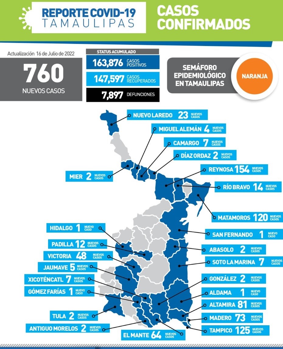 Estos nuevos casos del sábado en la quinta ola de Covid 19 se reportan en 25 de los 43 municipios de Tamaulipas, siendo los de mayor número Reynosa 154, Tampico 125, Matamoros 120, Altamira 81, Madero 73, El Mante 64, Victoria 48, Nuevo Laredo 23, Río Bravo 14 y Padilla 12, entre otros.