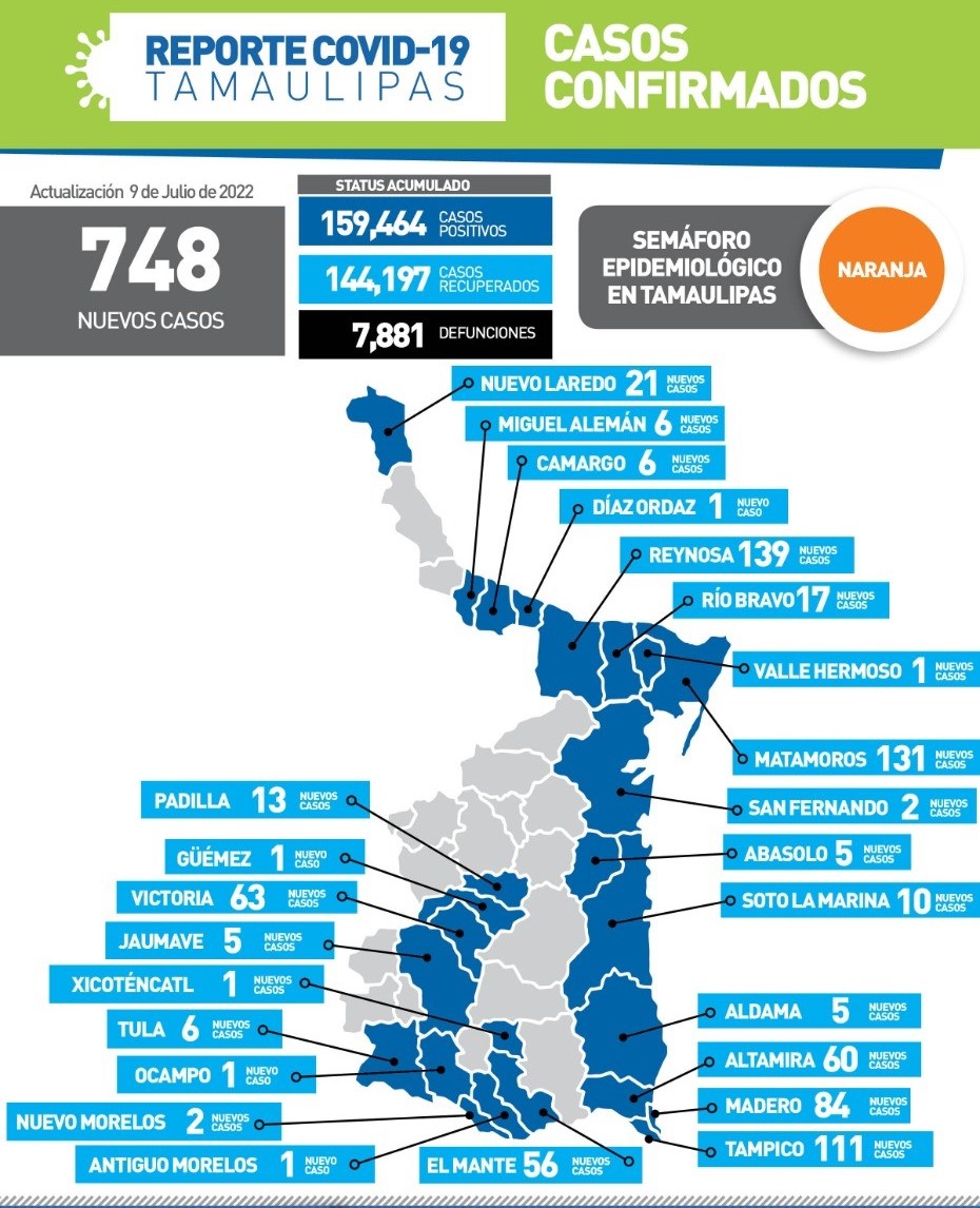 Los 748 nuevos contagios reportados este sábado se registraron en 25 de los 43 municipios de la entidad siendo los de mayor número de enfermos Reynosa 139, Matamoros 131, Tampico con 111, Cd. Madero 84, Victoria 63, Altamira 60, El Mante 56, Nuevo Laredo 21, Río Bravo 17, Padilla 13 y Soto la Marina 10, entre otros.
