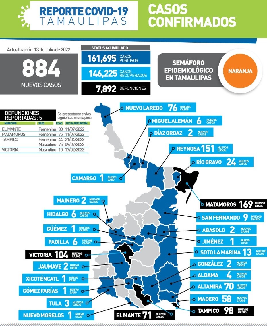 Los nuevos 884 contagios se dieron en 27 de los 43 municipios, siendo el mayor número de ellos en Matamoros 169, Reynosa 151, Victoria 104, Tampico 98, Nuevo Laredo 76, El Mante 71, Altamira 70, Madero 58, Río Bravo 24, Soto la Marina 13 y San Fernando 9, entre otros.