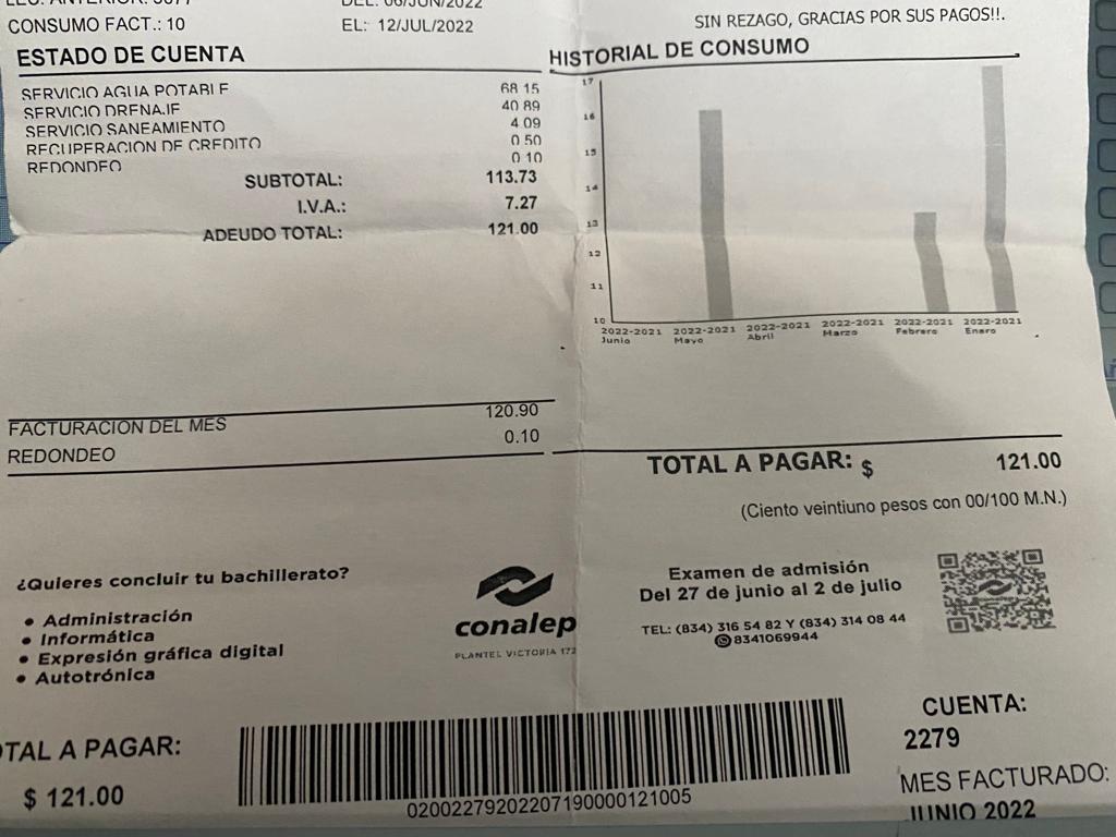 CD. VICTORIA, TAMAULIPAS, 18 DE JULIO DE 2022.- La Comisión Municipal de Agua Potable y Alcantarillado de Victoria, incrementó en un 7 por ciento las tarifas ordinarias en el caso de cobro mínimo por servicio a los usuarios, al pasado de 113 a 121 pesos en el último mes de facturación.