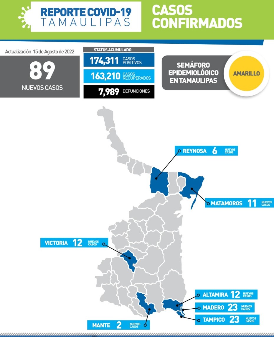 De los 89 casos, corresponden 23 a Tampico, 23 en Madero, 12 en Altamira, 12 en Victoria, 11 en Matamoros, 6 en Reynosa y 2 en El Mante, por lo que el semáforo del Covid-19 sigue en amarillo en la entidad.
