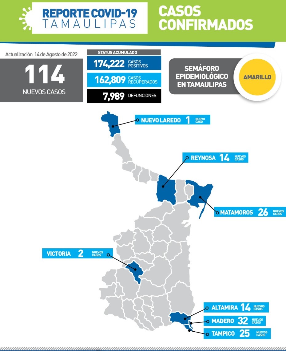 De los nuevos contagios 32 son de Madero, 26 en Matamoros, 25 en Tampico, 14 en Altamira, 14 en Reynosa, 2 en Victoria y 1 en Nuevo Laredo.