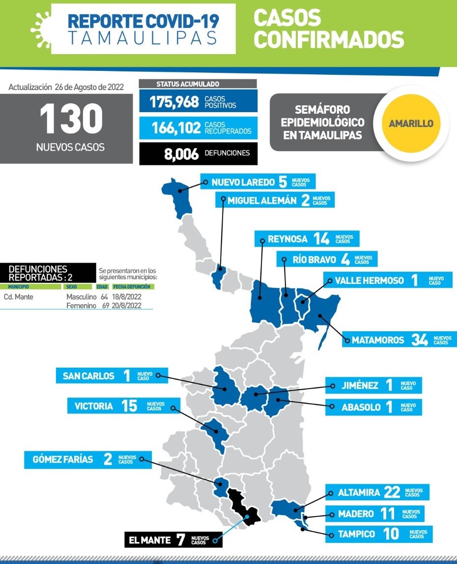CD. VICTORIA, TAMAULIPAS, 26 DE AGOSTO DE 2022.-Tras concluir la jornada de este viernes con 130 nuevos casos de COVID-19, la secretaria de Salud de Tamaulipas, Gloria Molina