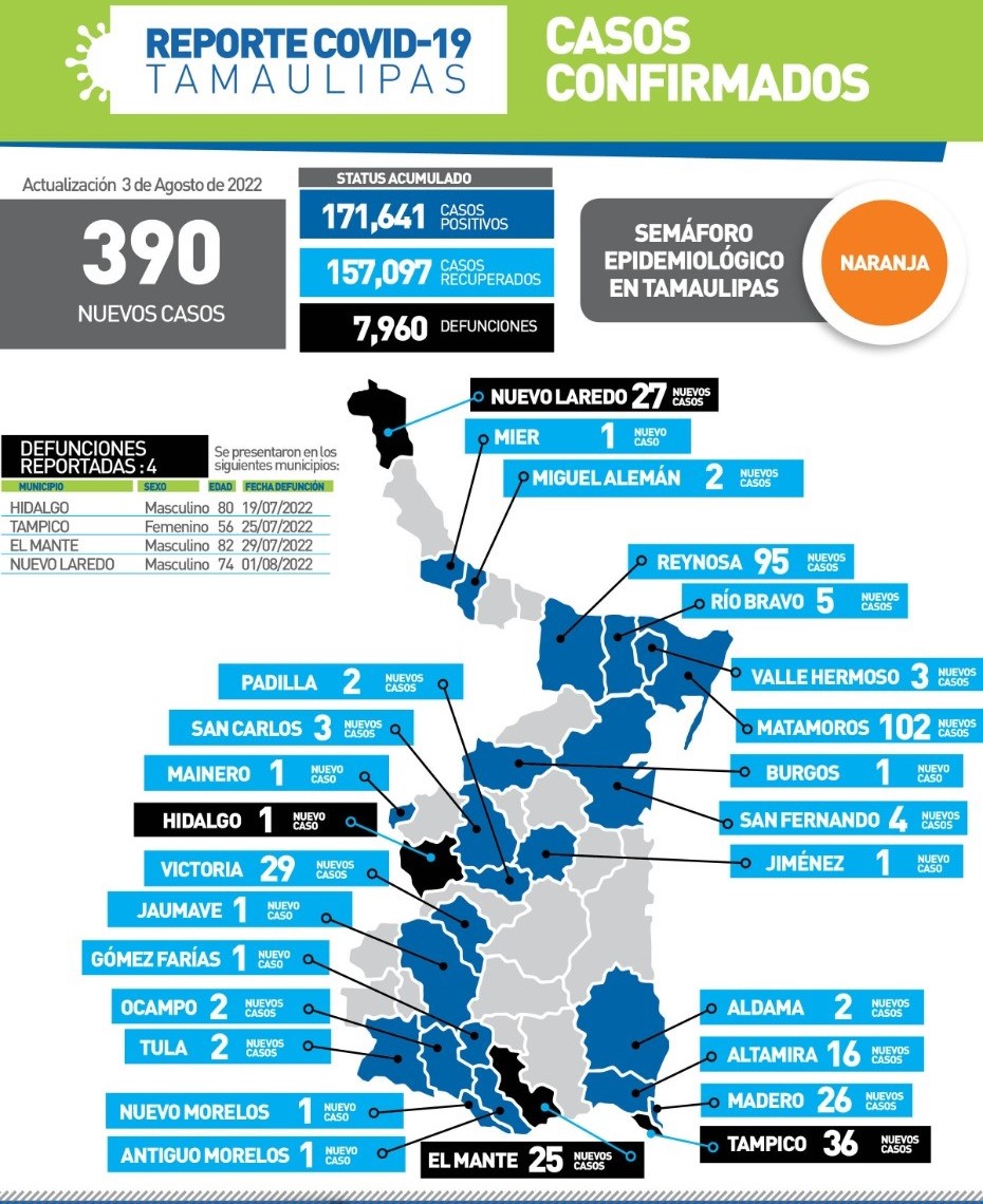 De los 390 nuevos contagios, la mayor parte ocurrieron en los municipios de Matamoros con 102, Reynosa 95, Tampico 36, Victoria 29, Nuevo Laredo 27, Tampico 26 y Altamira 16, entre otros.