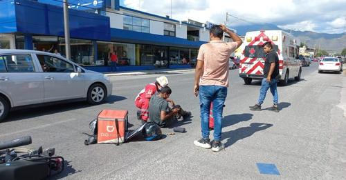 CD. VICTORIA, TAMAULIPAS, 2 DE SEPTIEMBRE DE 2022.- Lesionado resultó un repartidor de “Didi Food” después de estrellar la motocicleta que manejaba en la parte lateral de un automóvil cuya conductora omitió una señal de alto.