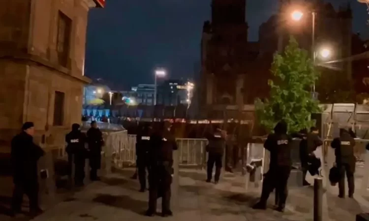 Elementos de la policía capitalina, equipados con escudos, también participan, desde la madrugada, en un cerco de seguridad en las calles aledañas al Palacio.