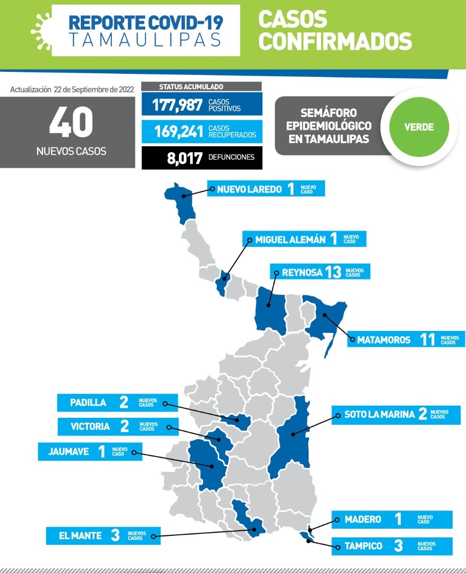 CD. VICTORIA, TAMAULIPAS, 22 DE SEPTIEMBRE DE 2022.– Aunque los casos de COVID-19 han disminuido durante las últimas semanas, es fundamental no bajar la guardia ni relajar las medidas de prevención para evitar un rebrote de la enfermedad, señaló desde esta ciudad capital la secretaria de Salud de Tamaulipas, Gloria Molina Gamboa.