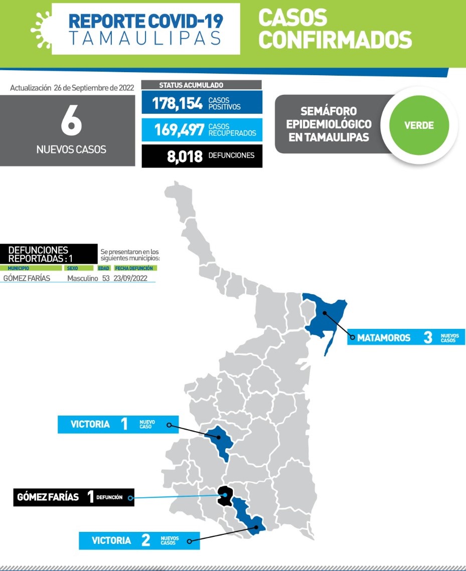CD. VICTORIA, TAMAULIPAS, 26 DE SEPTIEMBRE DE 2022.- Luego de confirmar 6 nuevos casos y el fallecimiento de un masculino de 53 años de edad por complicaciones graves de COVID-19, la