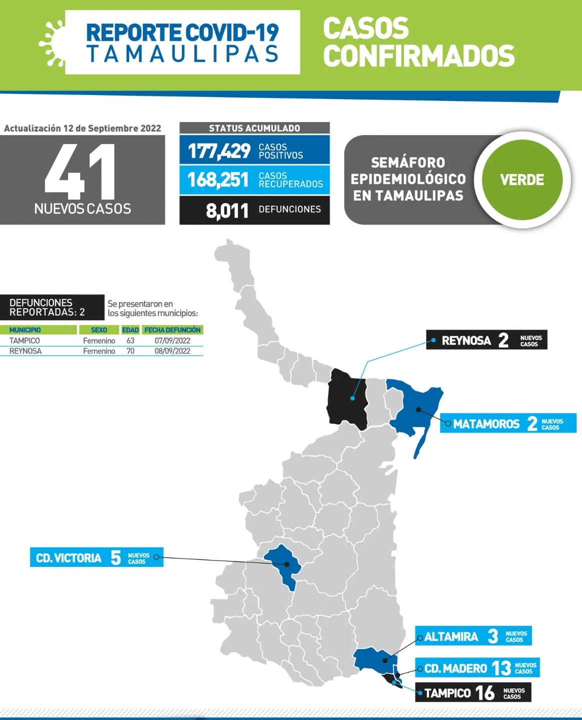 CD. VICTORIA, TAMAULIPAS, 12 DE SEPTIEMBRE DE 2022.- Tamaulipas sumó 41 nuevos casos de