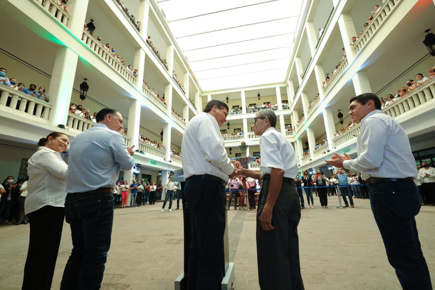 CD. VICTORIA, TAMAULIPAS, 9 DE SEPTIEMBRE DE 2022.– El Gobierno del Estado reconoció a Don Fernando Frausto Martínez, por dedicación y trayectoria en sus 67 años de servicio en el Palacio de  Gobierno como operador del elevador del lado oriente.