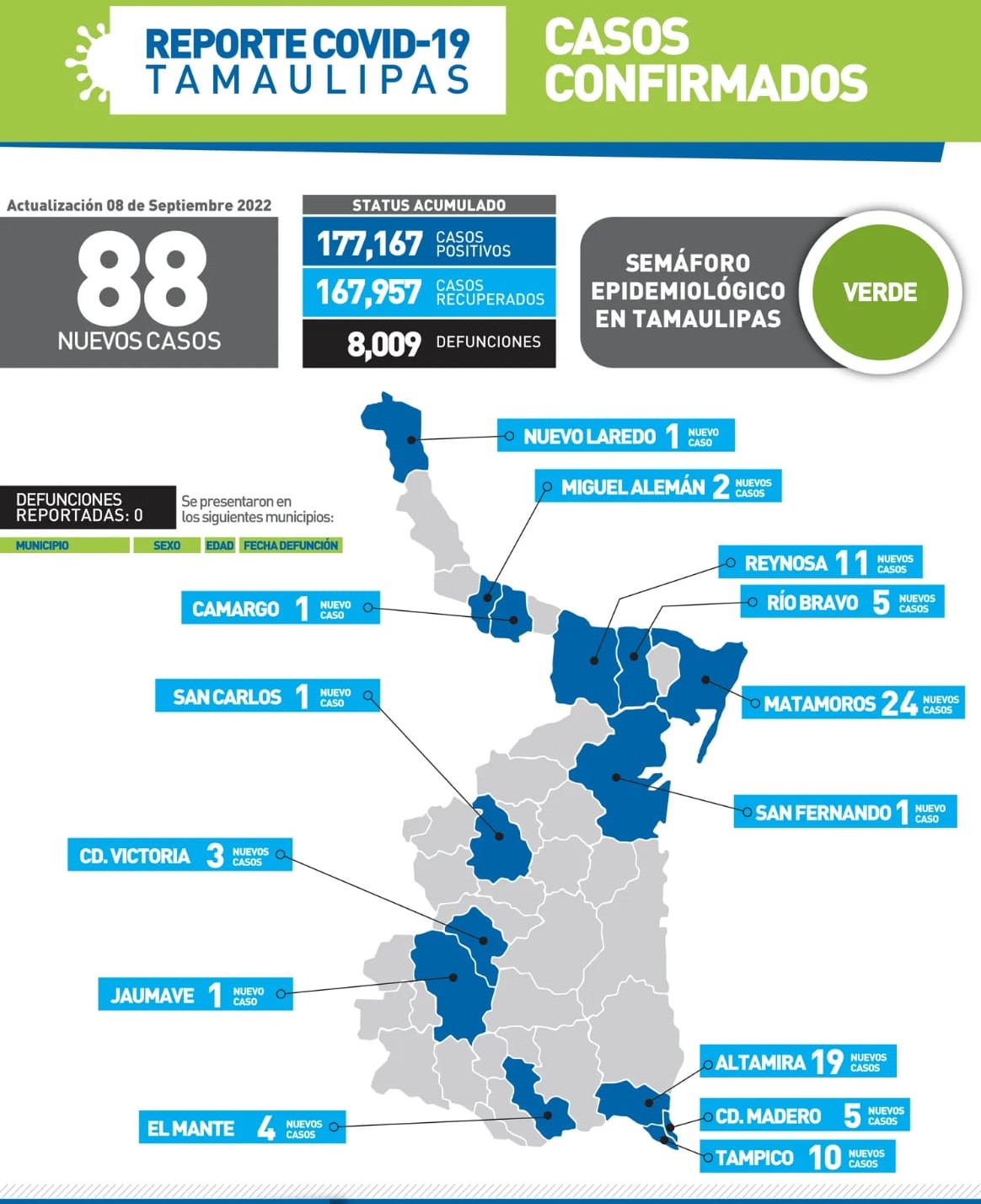 CD. VICTORIA, TAMAULIPAS, 8 DE SEPTIEMBRE 2022.- Tamaulipas sumó 88 nuevos casos de COVID-19 a su conteo oficial, informó desde esta ciudad capital la secretaria de Salud, Gloria Molina Gamboa al reiterar su llamado a atender en el hogar, la escuela, los espacios públicos y privados o el trabajo las medidas de seguridad sanitaria para seguir enfrentando y terminar con la pandemia.