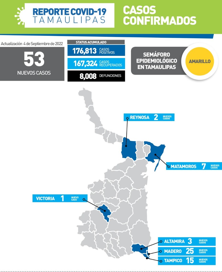 Reportan este domingo 53 nuevos contagios de Covid-19 en Tamaulipas