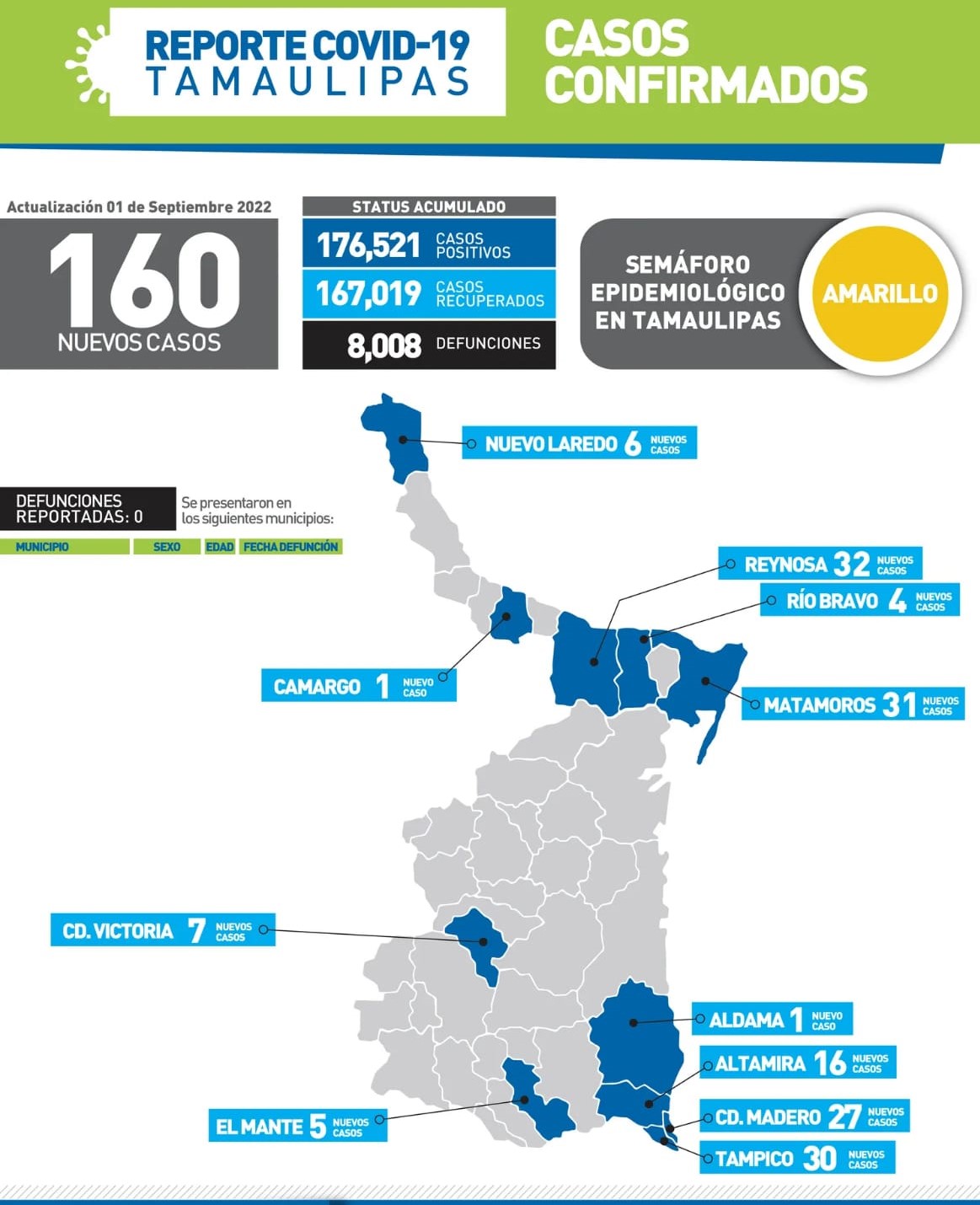 CD. VICTORIA, TAMAULIPAS, 1 DE SEPTIEMBRE DE 2022.-Tamaulipas cerró la jornada de este jueves con 160 nuevos casos de COVID-19, informó desde esta ciudad capital, la secretaria de Salud, Gloria Molina Gamboa tras reiterar su exhorto a no bajar la guardia y reforzar las medidas de prevención para continuar avanzando a la nueva realidad y la convivencia segura.
