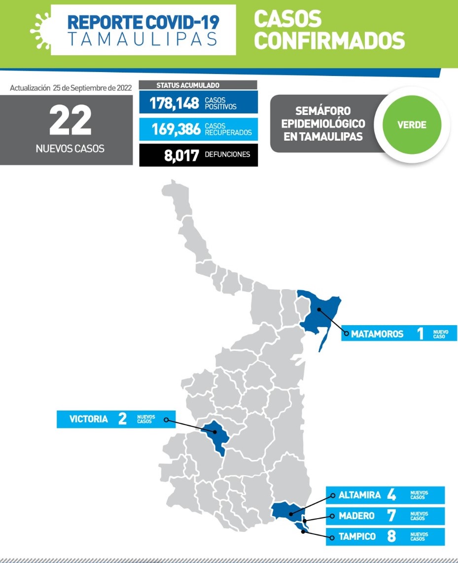 CD. VICTORIA, TAMAULIPAS, 25 DE SEPTIEMBRE DE 2022.- Tamaulipas cerró la jornada con 22 pacientes positivos a COVID-19, informó en su reporte diario la secretaria de Salud, Gloria Molina Gamboa quien reiteró su llamado a ser ciudadanos socialmente responsables y no bajar la guardia en la lucha contra la pandemia.