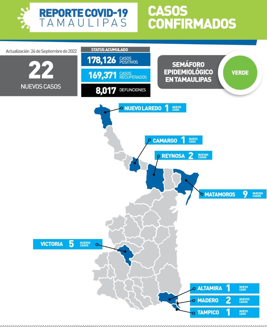 CD. VICTORIA, TAMAULIPAS, 24 DE SEPTIEMBRE DE 2022.- Tamaulipas sumó 22 nuevos casos de COVID-19 a su conteo oficial durante la jornada de este sábado, informó en su reporte técnico diario, la secretaria de Salud, Gloria Molina Gamboa, luego de pedir a la población atender las recomendaciones emitidas por el gobierno para sortear la emergencia sanitaria.