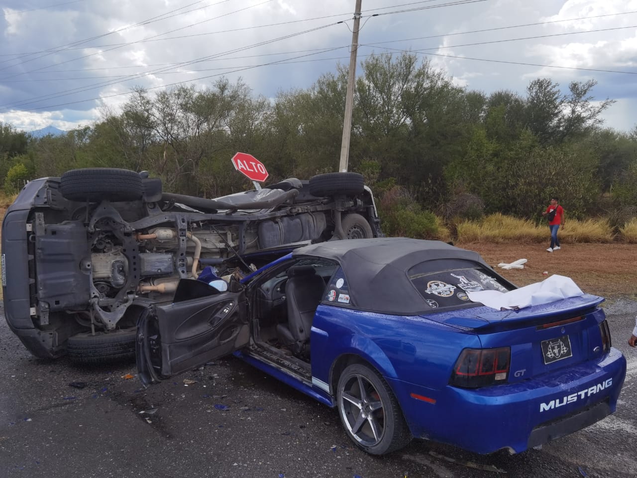 El impacto del vehículo Mustang se dio en el costado izquierdo de la camioneta por lo que la pickup terminó por volcar sobre uno de sus costados.