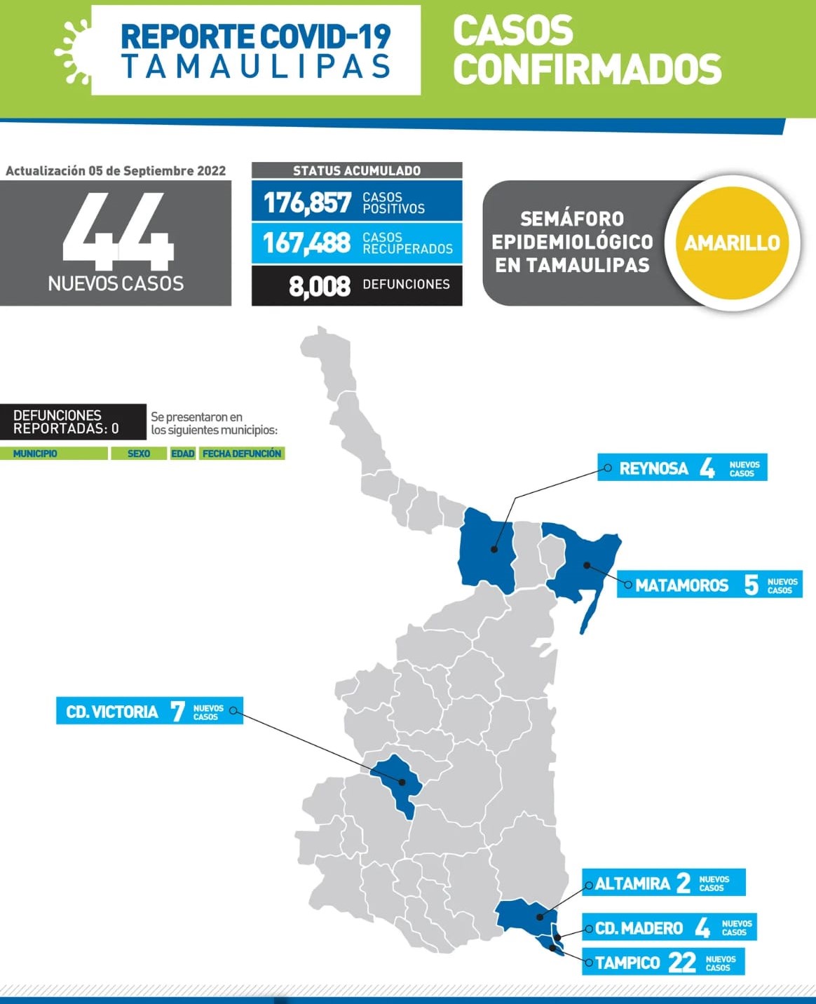 CD. VICTORIA, TAMAULIPAS, 5 DE SEPTIEMBRE DE 2022.-.Aunque la jornada de este lunes concluyó sin fallecimientos asociados a COVID-19, la secretaria de Salud de Tamaulipas, Gloria