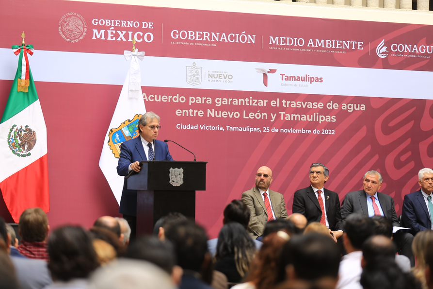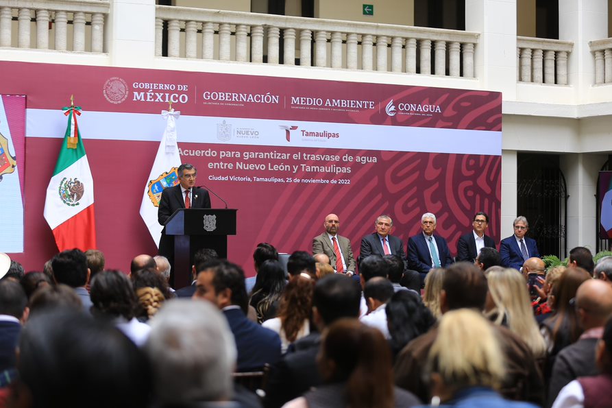 CD. VICTORIA, TAMAULIPAS, 25 DE NOVIEMBRE DE 2022.- El gobernador Américo Villarreal Anaya afirmó que el trasvase de agua entre Tamaulipas y Nuevo León no debe ser en el futuro, un asunto de negociación; “el acuerdo se respeta en sus términos para beneficio de ambos estados”, dijo y reconoció que siempre será mejor trabajar sobre las coincidencias y los intereses comunes.