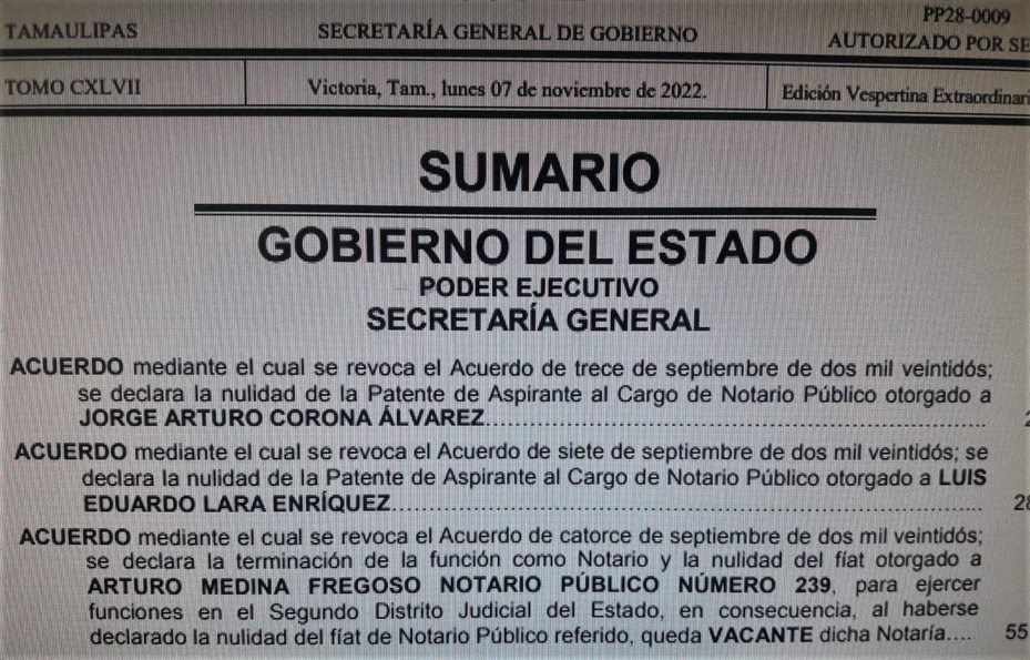 CD. VICTORIA, TAMAULIPAS, 8 DE NOVIEMBRE DE 2022.- Por no cumplir con los requisitos exigidos por la ley y por no garantizar la impartición de una función notarial que atienda al orden público e interés social, el Gobierno del Estado publicó en el Periódico Oficial, la nulidad de la Patente de Aspirante a Notario Público otorgada a Jorge Arturo Corona Álvarez y a Luis Eduardo Lara Enríquez, y además canceló el fíat otorgado a Arturo Medina Fregoso como Notario Público