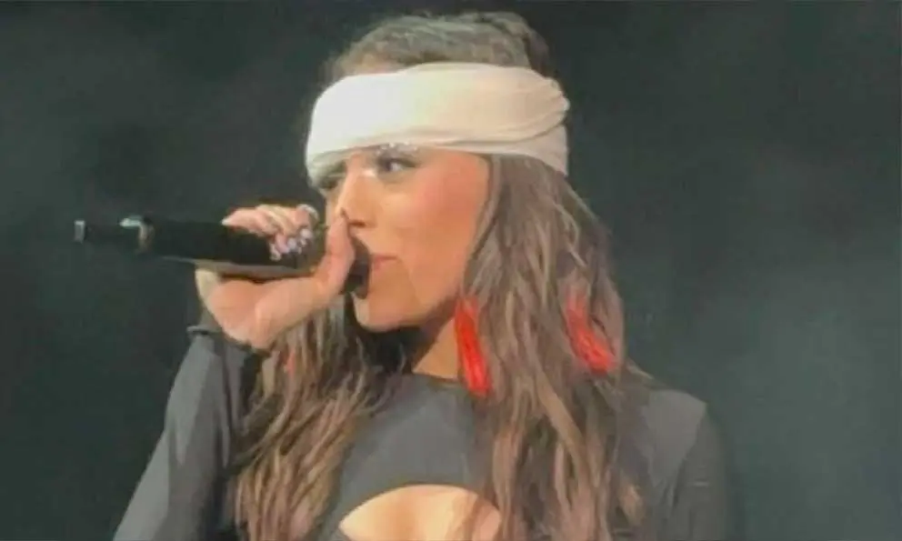 “Les voy a contar qué pasó: cuando me hice hacia atrás creo que me pegué con mi rodilla o algo así y se me empezó a inflamar el ojo, dejé de ver, pero yo seguí”, reveló la intérprete de Oye Pablo que aseguró que no iba abandonar el escenario, en donde fue vista con una venda en la cabeza.