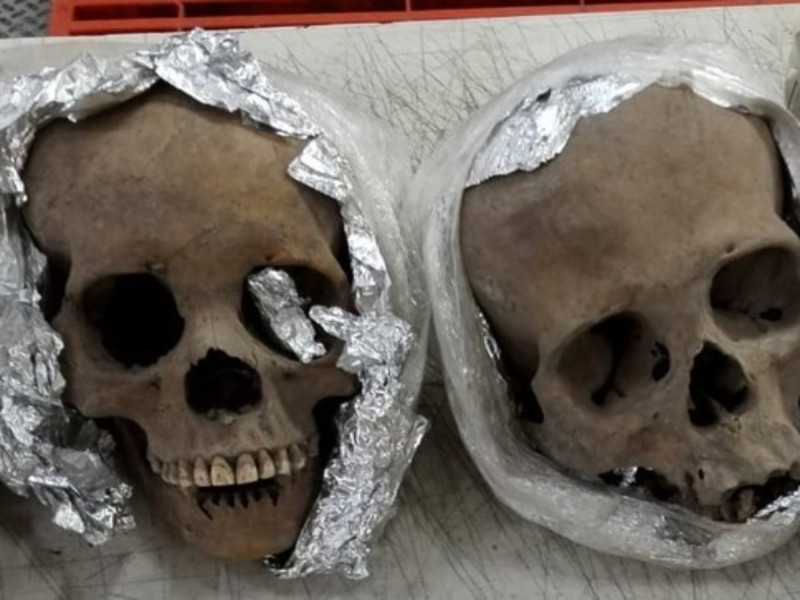 Al abrir una caja cartón, descubrieron los cuatro cráneos humanos de diferentes tamaños, envueltos en plástico transparente y papel aluminio.