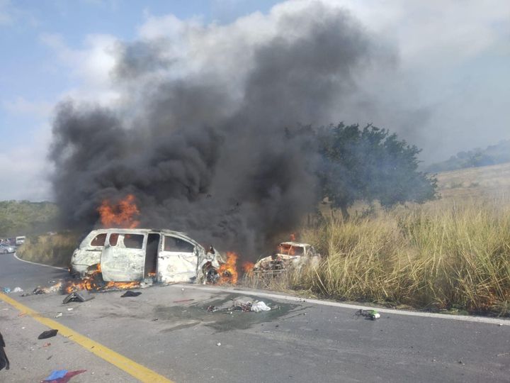Aldama, Tamaulipas (29 de diciembre de 2022).- El choque e incendio de dos vehículos dejó como saldo dos personas muertas calcinadas y otras tres heridas de gravedad en la carretera que conduce de Soto la Marina a Aldama.