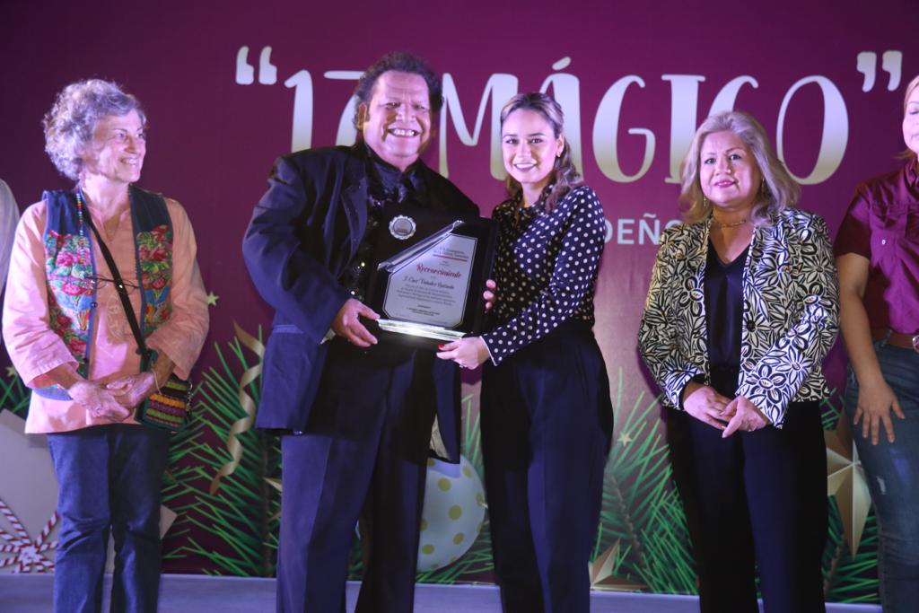 En la inaguración del festival navideño “17 Mágico” Lucy de Gattás entrego reconocimiento al artista victorense Cruz Valadez, a quien reconoció como uno de los baluartes de la promoción artística con que cuenta Ciudad Victoria.