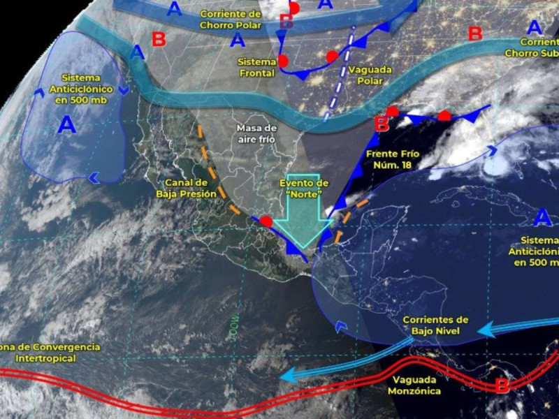 De acuerdo con el comunicado del organismo dependiente de la Comisión Nacional del Agua (Conagua), también persistirá el evento de “Norte” con rachas de 70 a 90 km/h en el Istmo y Golfo de Tehuantepec, y de hasta 70 km/h en las costas de Veracruz.