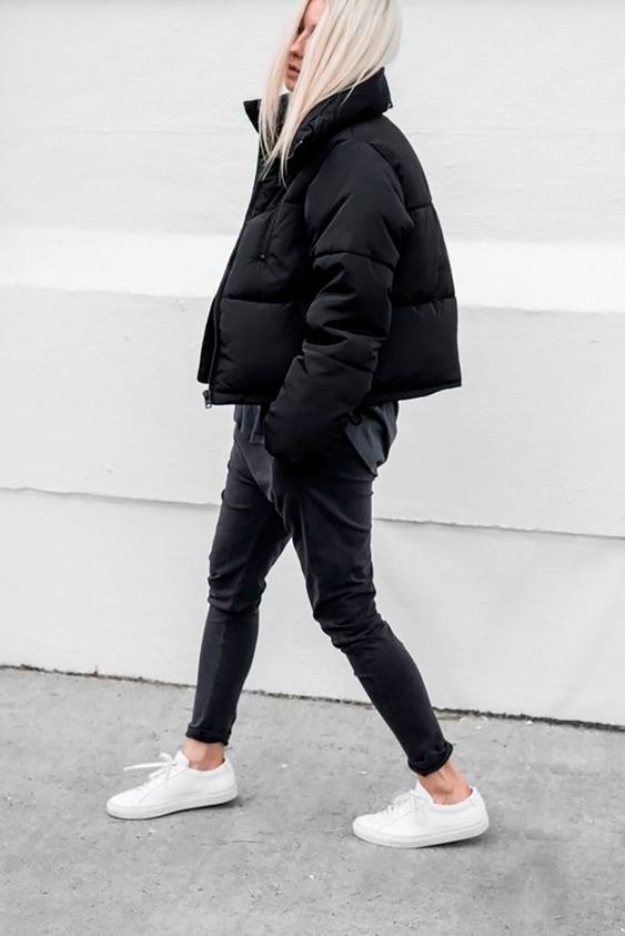 Los pantalones de piel no pasan de moda en invierno. Combínalos con una chaqueta negra que le dé el toque rockero pero con unos tenis blancos. Recuerda mostrar un poco de piel en los tobillos para que tenga una mejor estética.