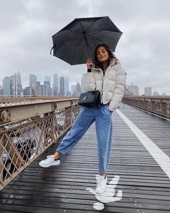No tengas miedo de esta combinación que no te verás como una enfermera. Combina tus pantalones blancos con un suéter oscuro y agrega un abrigo del mismo tono. Para evitar parecer que acabas de salir del hospital, dobla tus jeans o pantalones para mostrar un poco de piel.