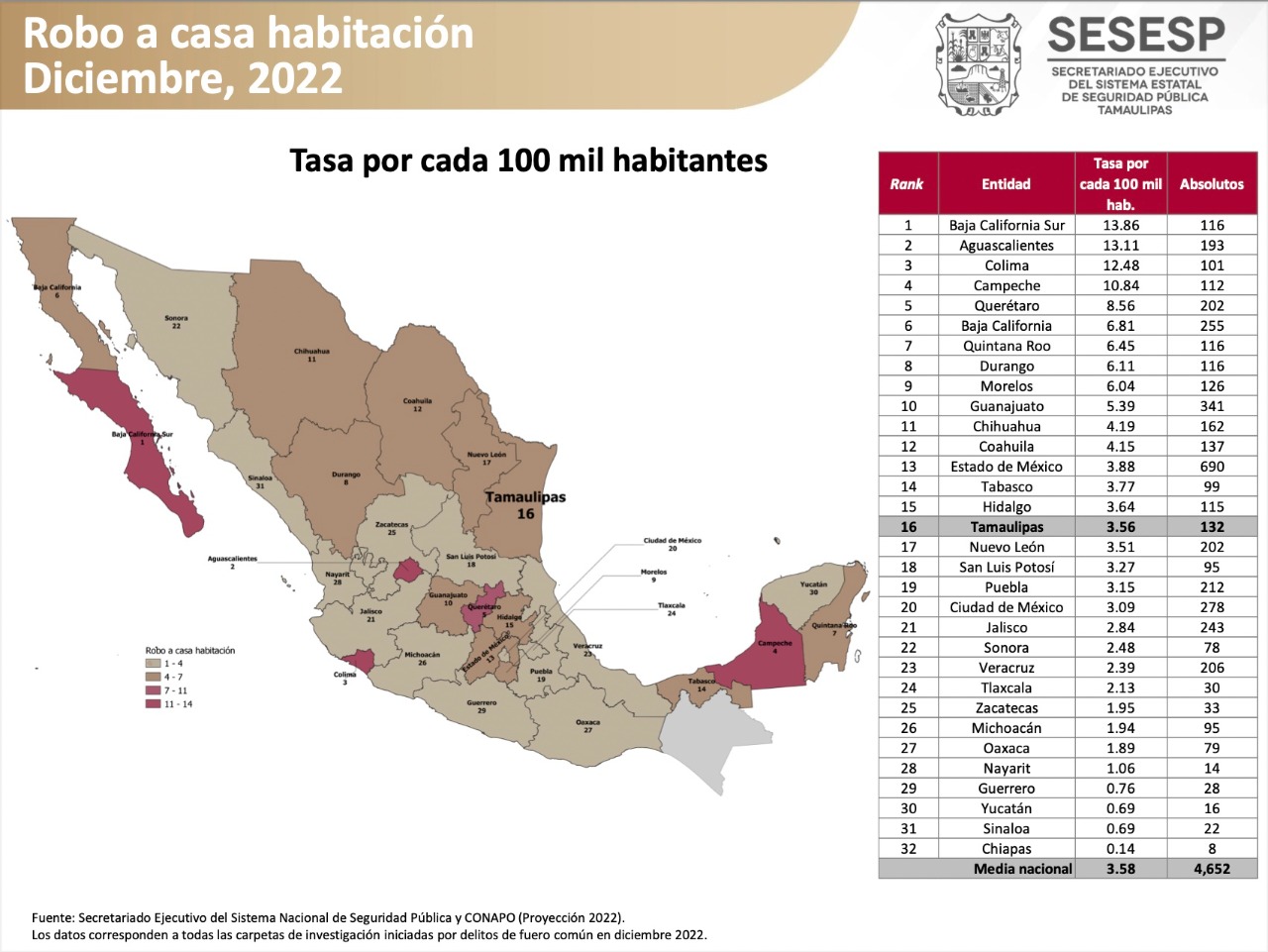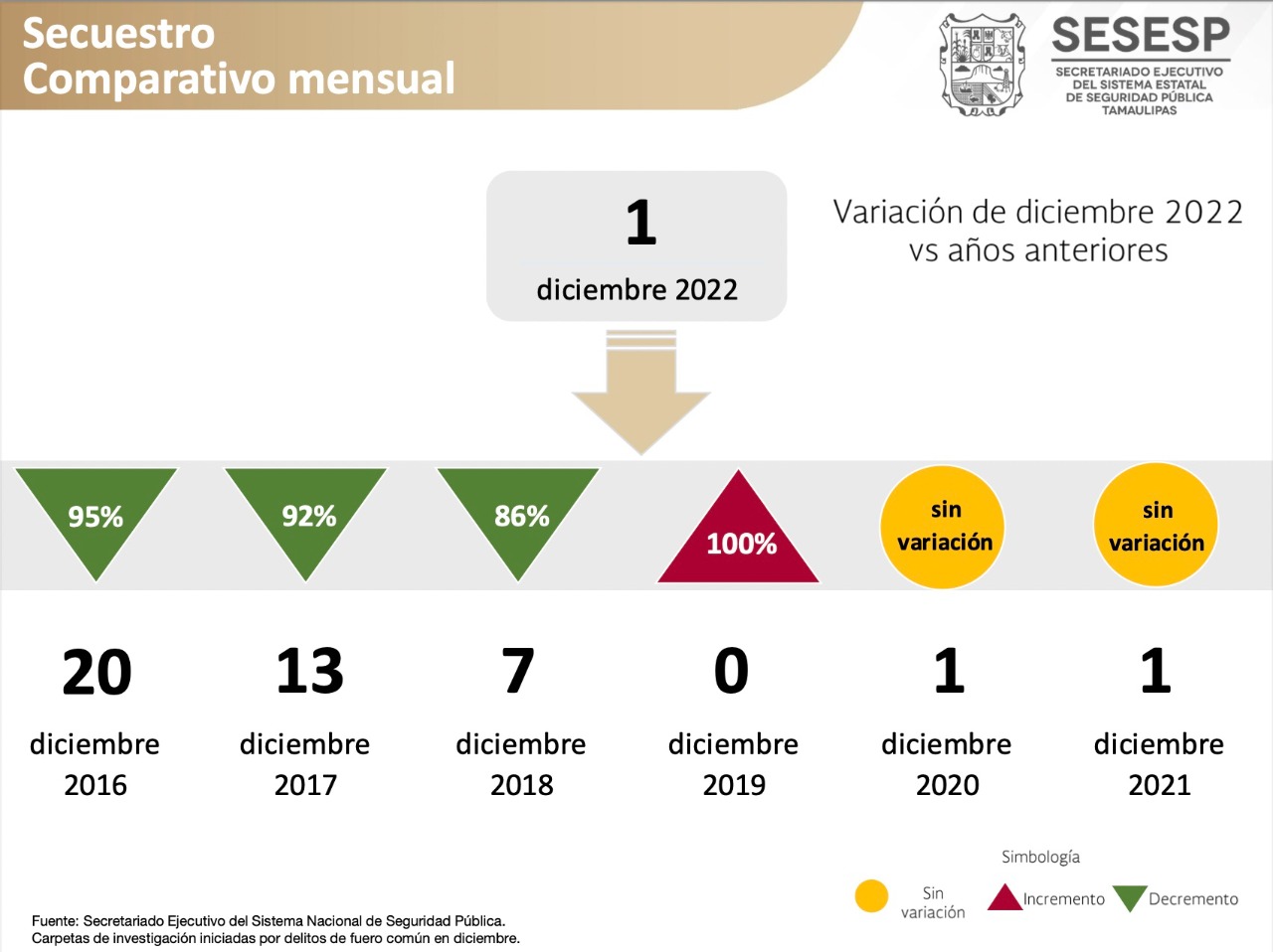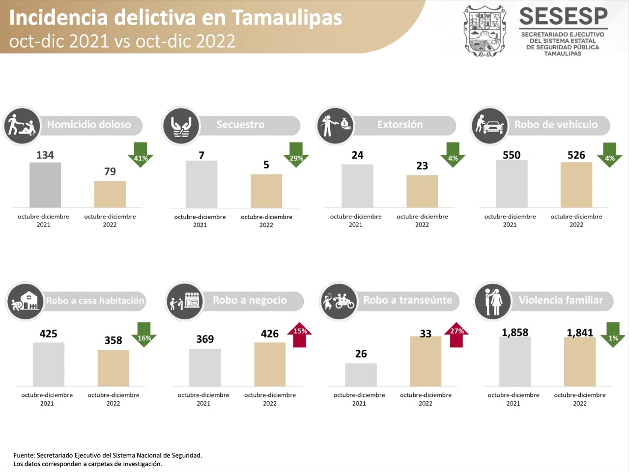 El reporte indica que en los meses de octubre a diciembre de 2022 en Tamaulipas, se registró un índice a la baja, en comparación al mismo periodo del 2021, en los casos de homicidio doloso (-41%); secuestro (-29%); extorsión (-4%); robo a casa habitación (-16%); violencia familiar (-1%); y robo de vehículos (-4%).