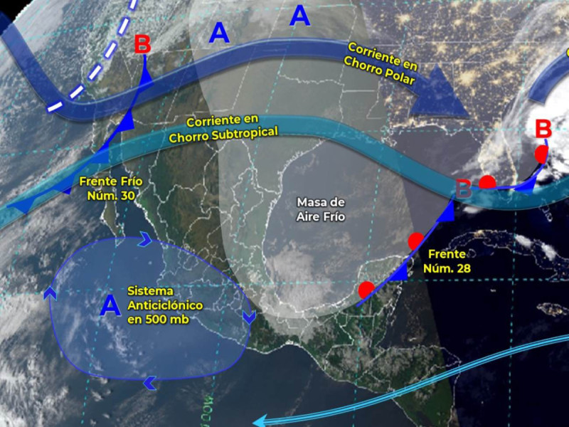 El frente frío 30 se desplazará sobre el noroeste del país y gradualmente sobre el norte de la República Mexicana, continuará interaccionando con una vaguada polar y con las corrientes en chorro polar y subtropical.
