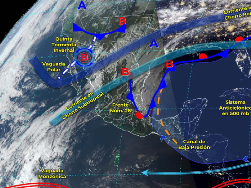 Por el frente frío número 28, reforzado por una nueva masa de aire frío, prevalecerá el ambiente frío a muy frío en las entidades de la Mesa del Norte, Mesa Central, oriente y centro de México, siendo gélido en el noroeste del país, se mantendrán bancos de niebla en el noreste, oriente y sureste de México.
