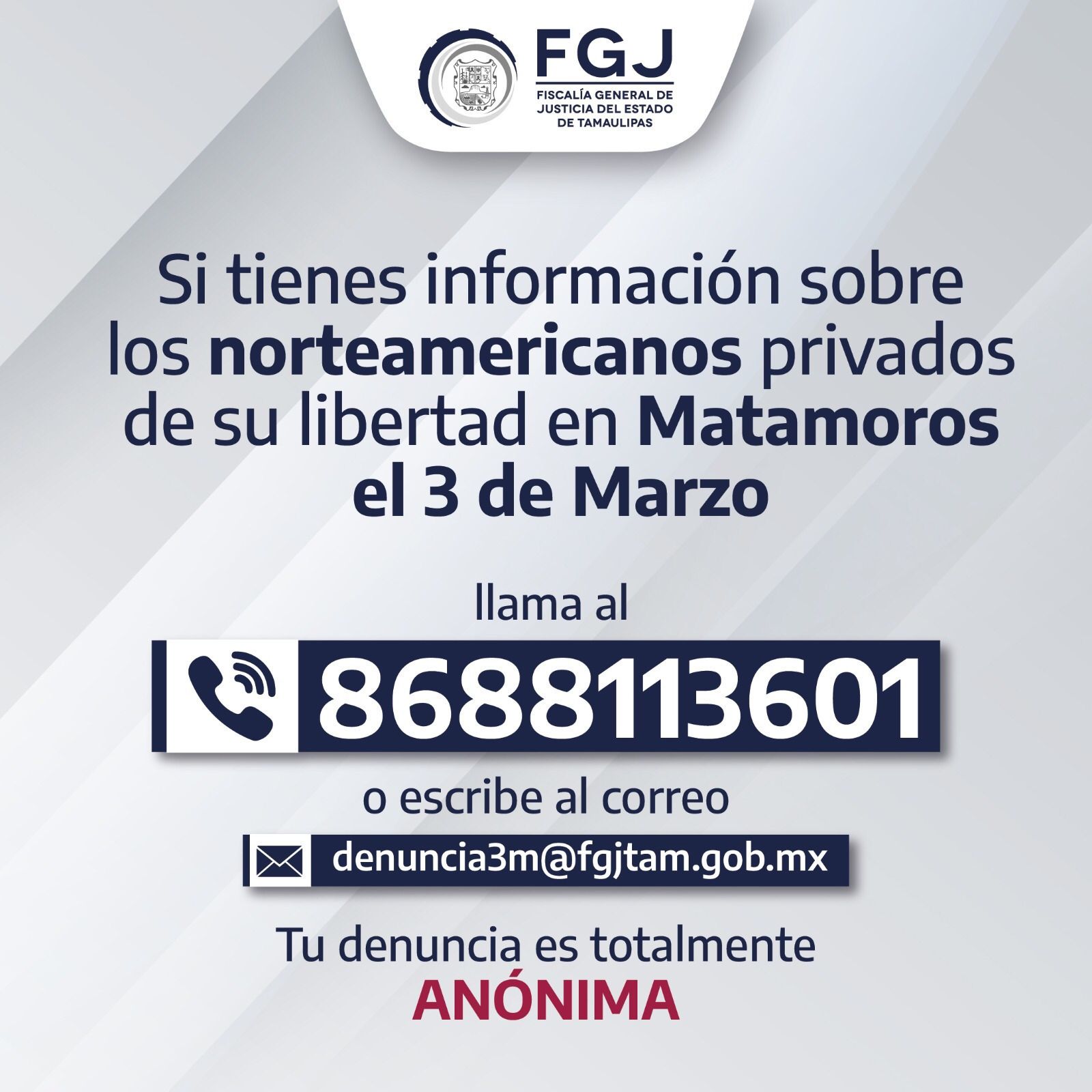 CD. VICTORIA, TAMAULIPAS, 6 DE MARZO DE 2023.- A través de redes sociales, la Fiscalía General de Justicia del Estado de Tamaulipas hizo el llamado a la población para que de manera confidencial y anónima proporcionen información sobre los cuatro norteamericanos privados de su libertad el pasado tres de marzo en Matamoros.