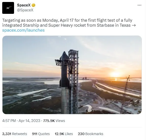 Villa de Boca Chica, Texas, 17 de abril del 2023.- La primer prueba de lanzamiento de un cohete espacial de la compañía SpeceX podría ocurri este lunes 17 de abril, esto después de que la Administración Federal de Aviación otorgara el permiso definitivo para llevarla a cabo.