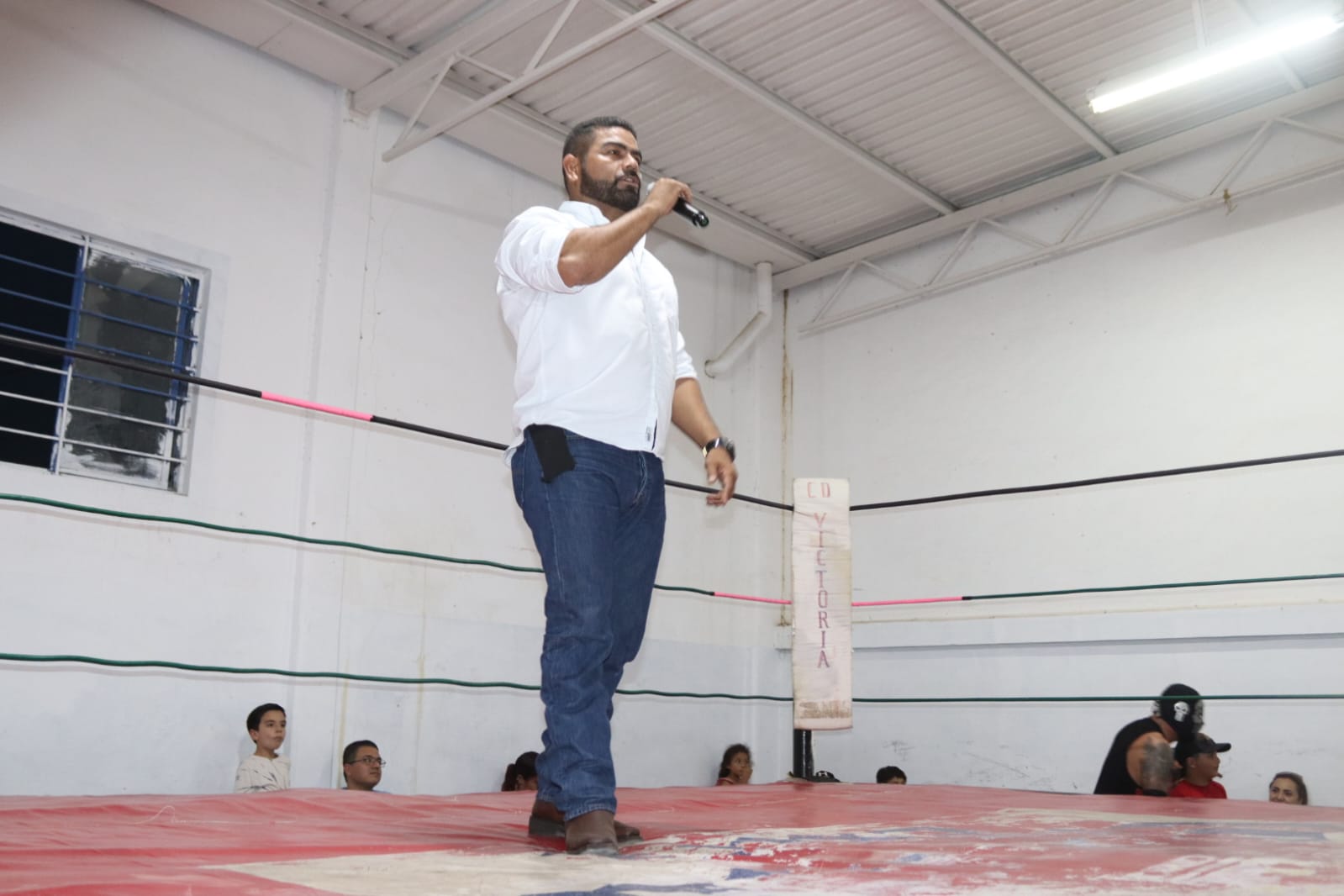 Al subir al cuadrilátero con micrófono en mano, Carlos Pizaña, jefe del Departamento del Deporte y la Juventud, expuso que el retorno de la Lucha Libre en esta capital, obedece a la buena disposición del presidente Lalo Gattás.