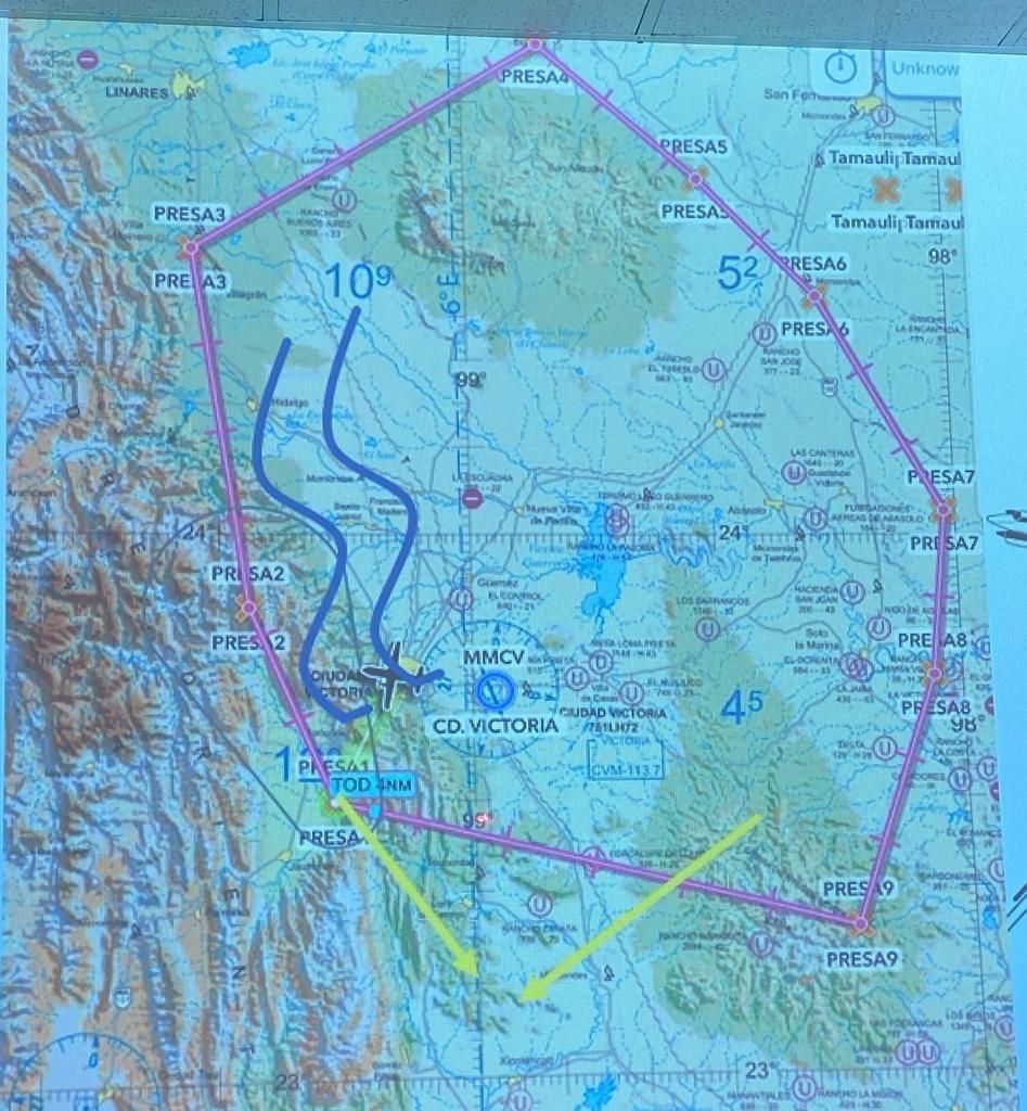 Para recorrer el polígono marcado que comprende los municipios Victoria, Güémez, Hidalgo, Villagrán, Villa Mainero, Abasolo y Padilla, la aeronave despegó del aeropuerto a las 14::45 horas.