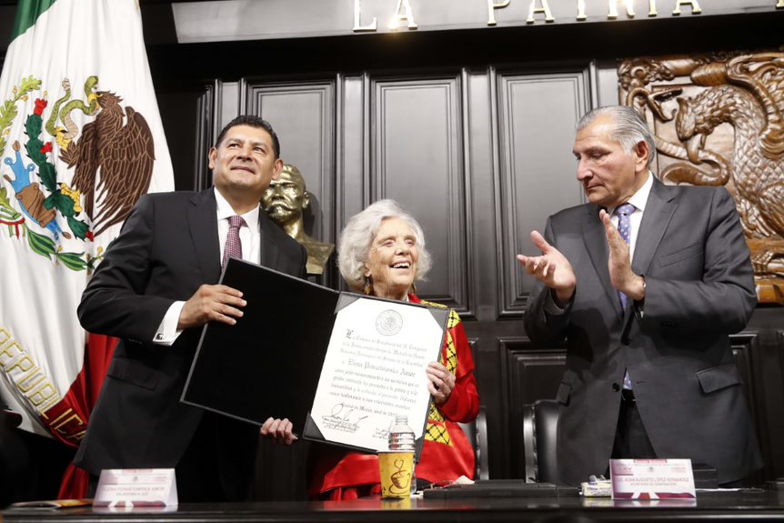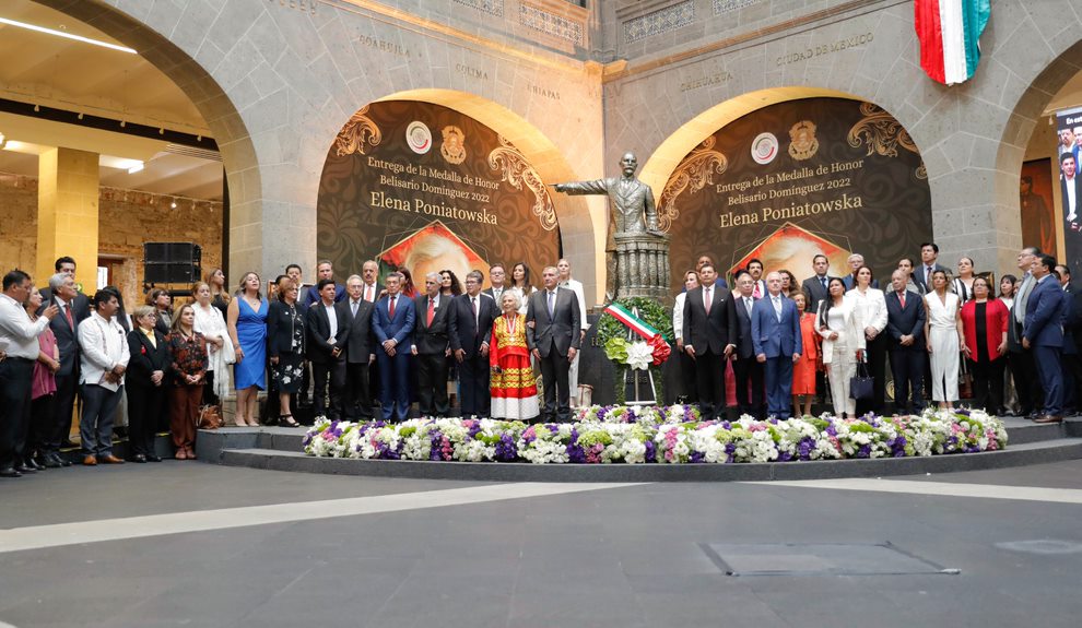CD. DE MEXICO, 19 DE ABRIL D 2023.- Como un merecido reconocimiento a su destacada trayectoria, el presidente de la Mesa Directiva, Alejandro Armenta, entregó la Medalla de Honor “Belisario Domínguez”, correspondiente a 2022, a la escritora, periodista y activista Elena Poniatowska Amor.