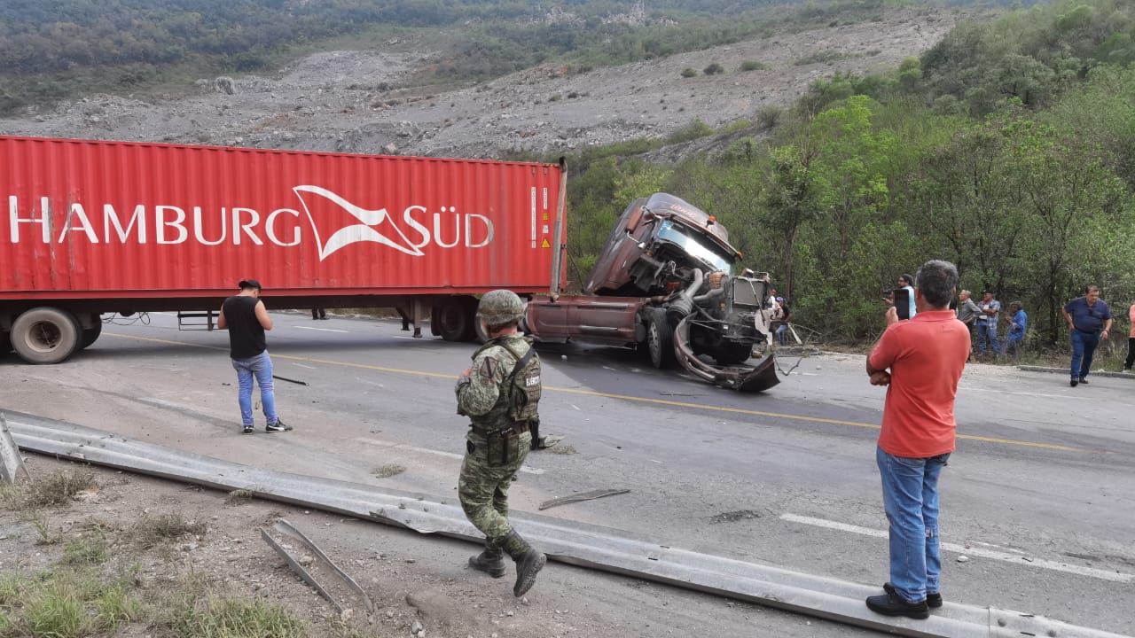 CD. VICTROIA, TAMAULIPAS, 21 DE ABRIL DE 2023.- Un trailero se salvó de caer con todo y la pesada unidad que tripulaba a un barranco de aproximadamente 50 metros de profundidad tras chocar contra el talud de la sierra en la carretera Rumbo Nuevo.