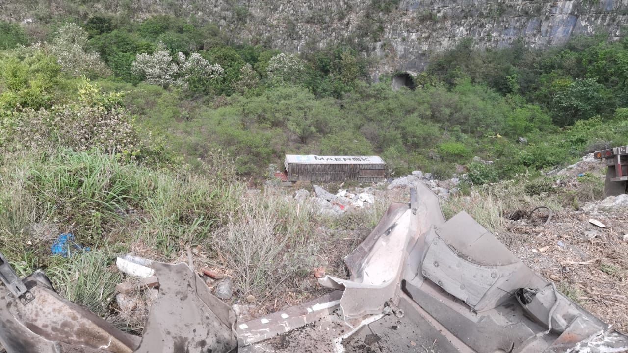 En el accidente en el cual el trailero milagrosamente salvó su vida, uno de los dos contenedores que transportaba el tráiler cayó a un barranco de al menos 50 metros de profundidad y el otro quedó atravesado impidiendo el tránsito vehicular a la altura del kilómetro 17 de la Carretera Rumbo Nuevo.