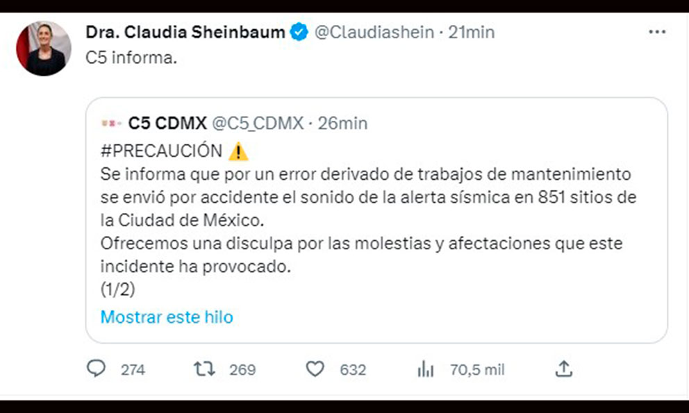 Fue un proceso de revisión de uno de los servidores y accionaron una alerta equivoca, pedimos disculpas”, dijo la Jefa de Gobierno.