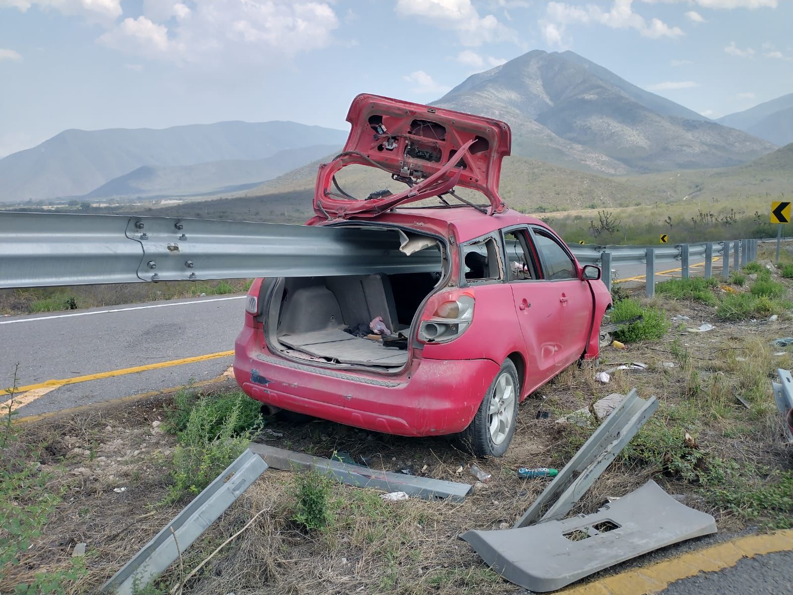 La barrera metálica arrancó el cofre del automóvil, se incrustó contra el parabrisas, atravesó todo el vehículo y salió por el medallón destrozando la puerta posterior.