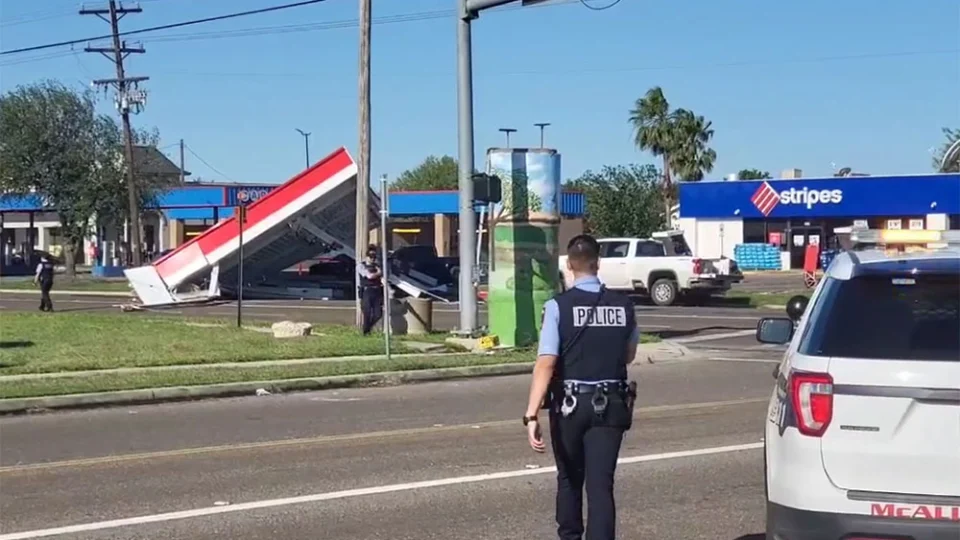 La tromba azotó la región del sur de Texas con vientos de 80 millas (128 km) por hora, lo que causo el desprendimiento de techos de casas y negocios, derribamiento de postes de luz, rompimiento de ventanales, caída de árboles y ramas.