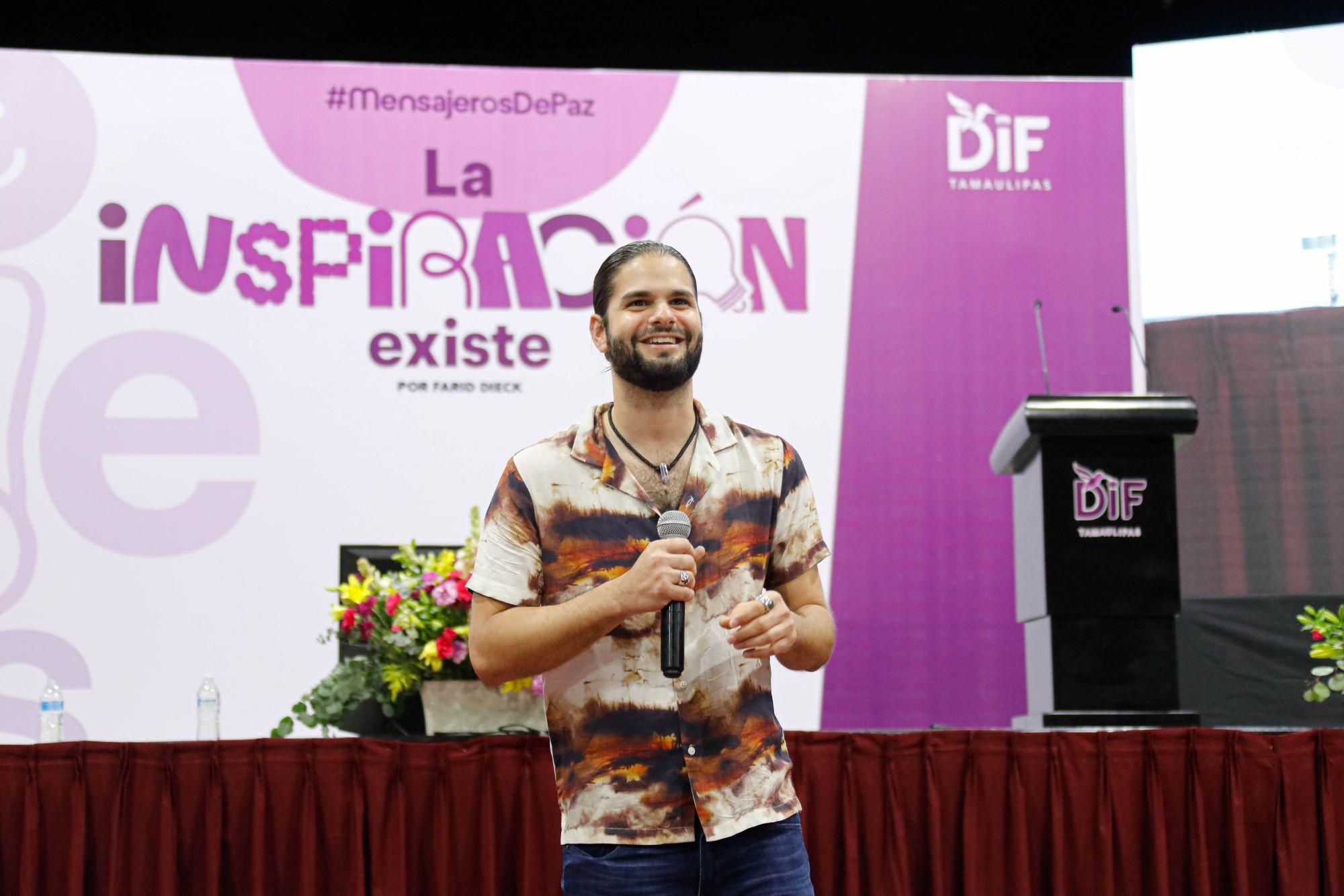 MATAMOROS, TAMAULIPAS, 18 DE MAYO DE 2023.-Para fomentar el bienestar y la sana convivencia, el Sistema DIF Tamaulipas que preside la doctora María Santiago de Villarreal, presentó en la ciudad de Matamoros la ponencia “La inspiración existe” por parte Farid Dieck, reconocido conferencista originario de Monterrey, Nuevo León.