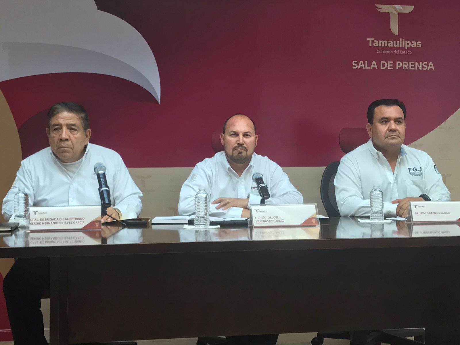 El Secretario de Seguridad Sergio Chávez García, el Secretario General de Gobierno Héctor Villegas González y el Fiscal General del Estado Irving Barrios Mojica en conferencia prensa abordan el tema de los incidentes de violencia y enfrentamientos entre grupos delincuenciales en Reynosa, Matamoros San Fernando y Jiménez, entre otros.