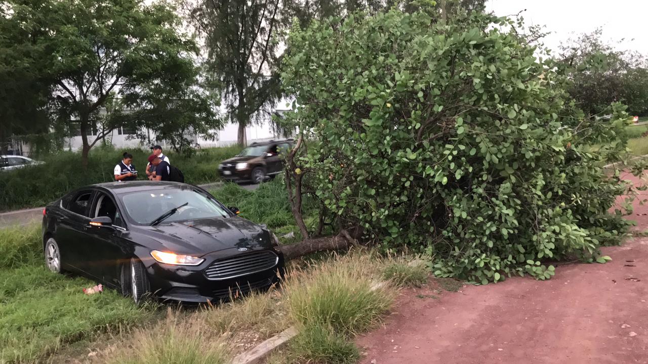 CD. VICTORIA, TAMAULIPAS, 10 DE JUNIO DE 2023.- Cuando circulaba presuntamente a exceso de velocidad por el libramiento Naciones Unidas, un conductor salió del camino y derribó con su automóvil un árbol de considerables dimensiones.