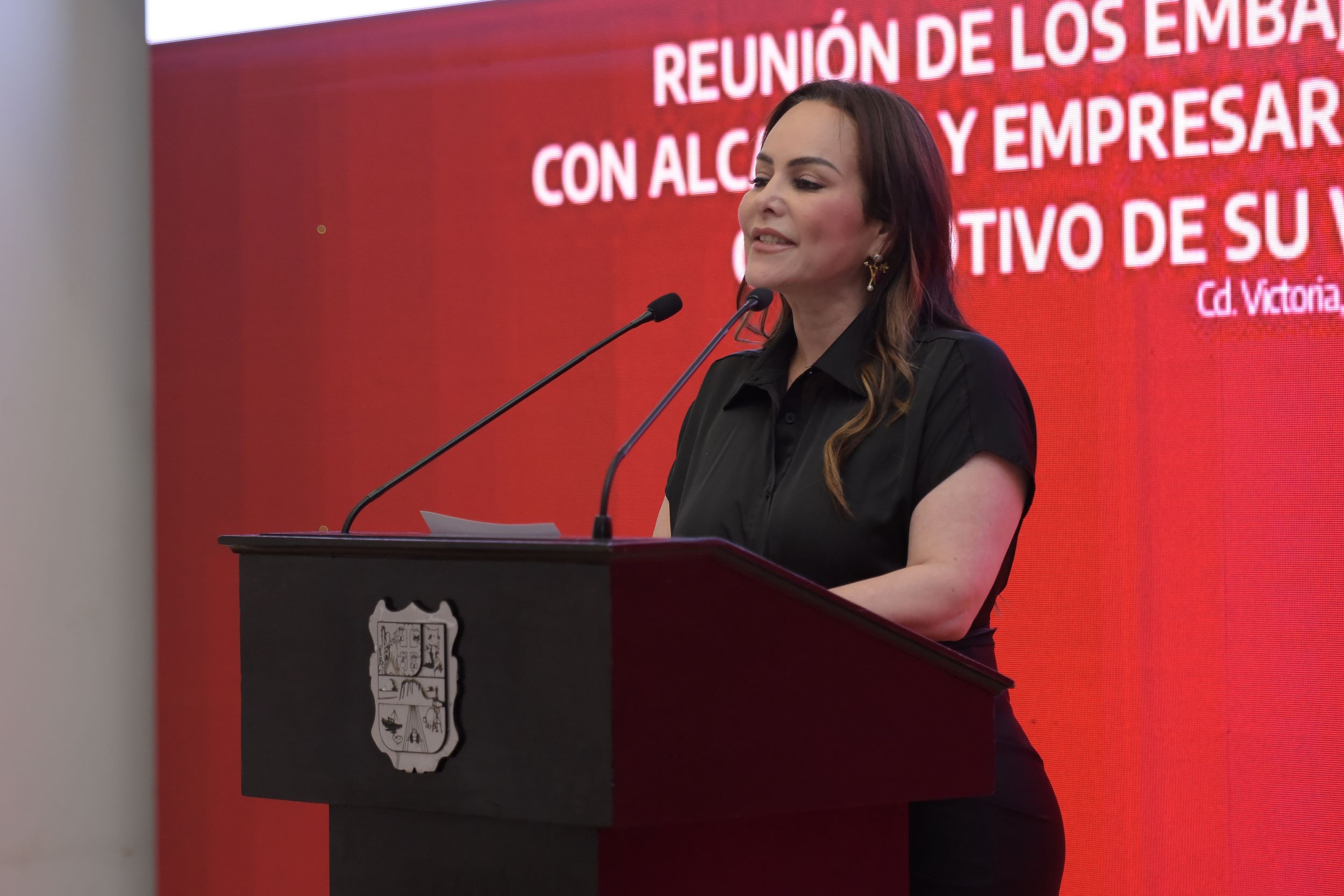 CD. VICTORIA, TAMAULIPAS, 23 DE JUNIO DE 2023.-La presidenta municipal de Nuevo Laredo y los presidentes de Reynosa, Matamoros y Victoria expusieron ante los embajadores de países miembros de la Unión Europa, que realizan una visita oficial a Tamaulipas, las bondades y ventajas competitivas de sus respectivas comunidades como atractivos polos de desarrollo para posibles inversiones.