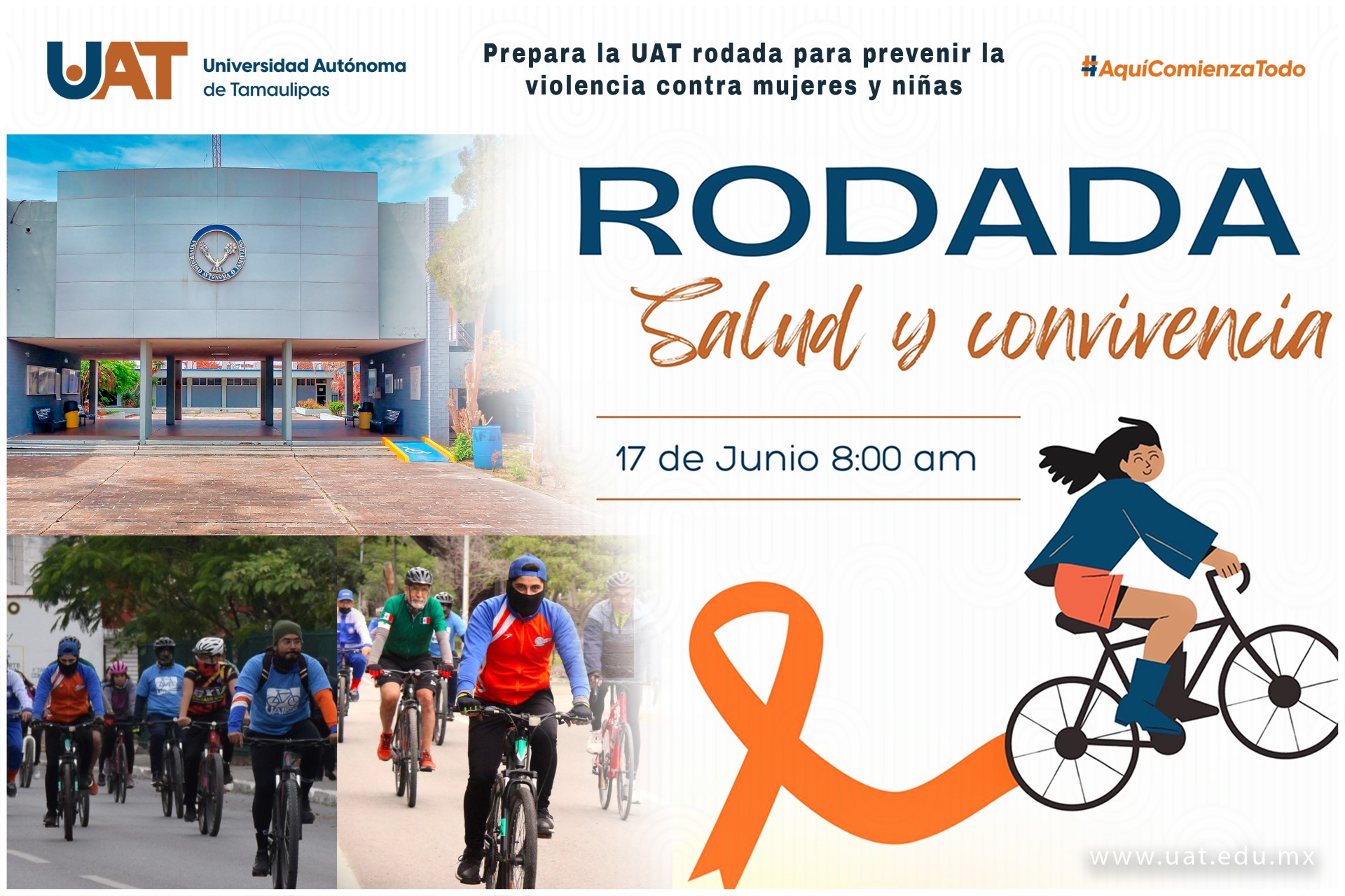 CD. VICTORIA, TAMAULIPAS, 10 DE JUNIO DE 2023.– La Universidad Autónoma de Tamaulipas (UAT), a través de la Unidad Académica Multidisciplinaria de Matamoros (UAMM), prepara un recorrido en bicicleta con el propósito de sensibilizar respecto a la prevención de la violencia contra mujeres y niñas.